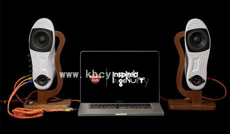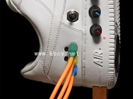 把一双鞋子改装成为扬声器,不得不说一个这个创意就是cooool。这是由艺术家Nashmoney为Inspired Ingenuity竞赛而设计的一个项目,他借用了nike的经典版Air Force 1鞋,喇叭安装在鞋底,旋钮以及插孔则安装在了中底外侧,电路板安放在了鞋款的内部,最后用木质支架对Air Force 1扬声器进行支撑。