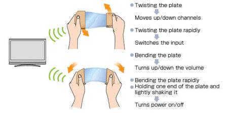 随着设计理念的创新与科学技术的进步,遥控器在外形及功能方面也发生了较大的变化。这款透明遥控器就是通过弯曲、扭曲等动作控制电视的。它的主要组成部分是有机压电薄膜,不仅可以感知扭曲、弯曲等动作,同时也能够区分不同的动作频率。因此,使用者可以通过弯曲透明薄膜来调整音量,而一旦他们快速弯曲透明薄膜则可以控制电视的开关。为了确保遥控器在无外接电源的情况下也能正常使用,该遥控器的内部还装有硒电池,可以持续将光能转换为电能。